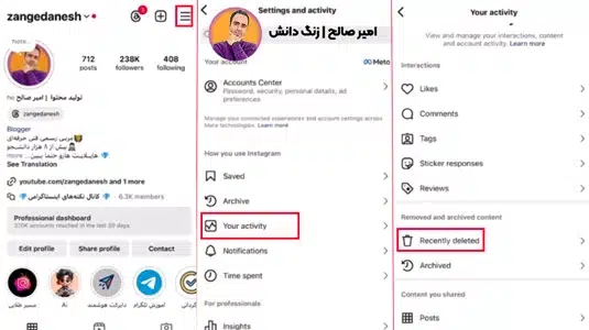 اما یه ترفند باز وجود داره. شما میتونی مثلا بیای یک استوری رو بزاری. مثلا این استوری رو یا هر استوری رو بزاری. و درجا که شیرش کردی پاکش کنی. یعنی این استوری به محض اینکه شیر شد. پاک بشه. و بعد از اینکه این کار رو کردی بیای روی سه خط بالا بزنی. your activity و توی بخش recently deleted .