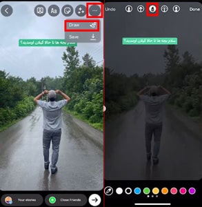 از بخش استوری ها وقتی که عکس مورد نظر خود را گذاشتیم، برای این که یک هاله روی آن قرار گیرد، از بخش Draw قلم سوم را انتخاب می کنیم.
