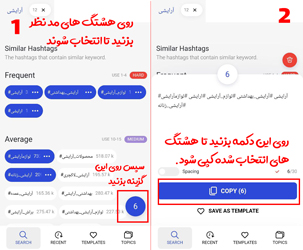برای استفاده از این هشتگ ها روی هر کدام که می خواهید بزنید. تا انتخاب شوند. سپس روی دایره پایین که تعداد هشتگ هایی که انتخاب شده را نشان می دهد، بزنید.